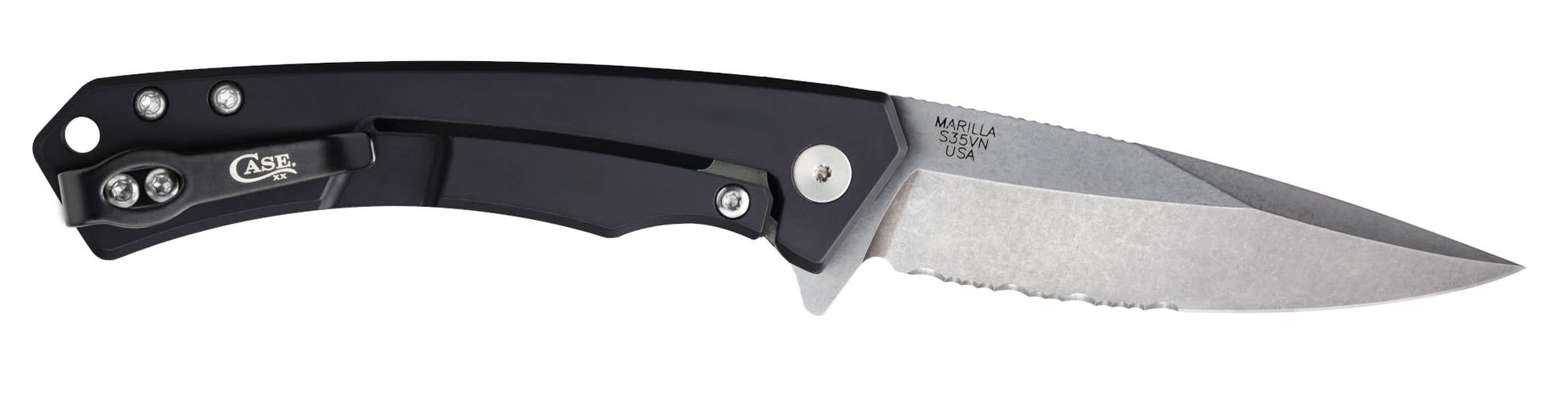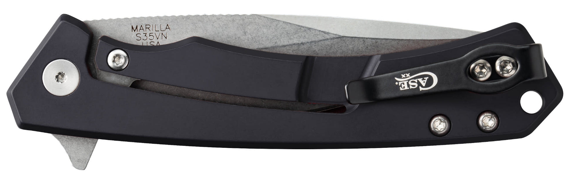 The Marilla® marks a modern chapter for Case knives. This new one-handed opening knife features a S35VN stainless steel Drop Point blade with a stonewashed satin finish. The knife handle is made of durable, lightweight anodized aluminum and a textured dark brown G-10 center inlay for a reliable grip. Its flipper design offers quick and reliable deployment with a simple flip of your index finger and snaps open on a ball bearing pivot. The frame locking mechanism secures the blade in position when fully opened. A reversible deep carry steel pocket clip allows for a comfortable, and versatile, pocket carrying experience. The Marilla® name is shared with a local spring that's been a favorite spot for locals to explore and the knife is part of the first collection of Modern Everyday Carry knives to be made in our Bradford, PA factory.