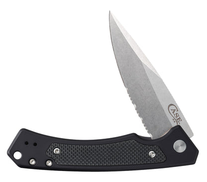 - Stonewash Satin S35VN stainless steel blades; Lightweight Black Anodized Aluminum with Black G10 Inlay handle