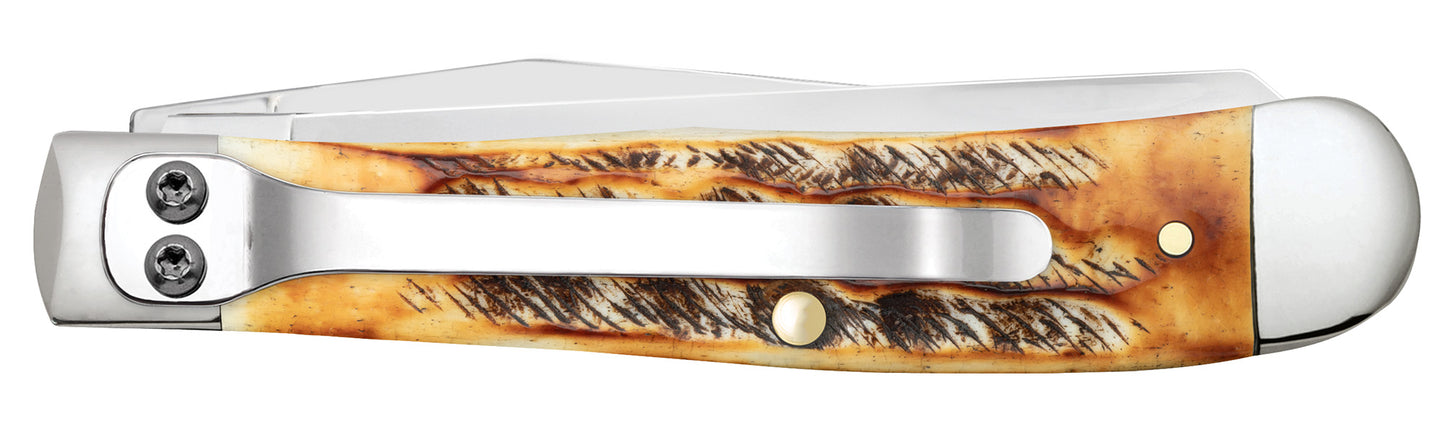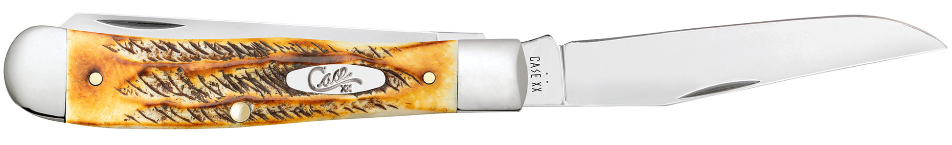 Made to look beautifully worn, this genuine bone handle’s honey and amber tones are accented with special jigging – and hand-flamed – to look and feel like authentic stag antler. Secondary “6.5” blade tang stampings remind you these knives are extra special. The Trapper gets its name from the consumer it was designed for. It is a jack knife with two full length blades; a slender Clip and a long Spey. The Clip blade is commonly used as a multi-purpose blade and preferred for detail work while the Spey blade is commonly used as an all-purpose utility blade. This knife is constructed with Case Tru-Sharp™ stainless steel which is a special high-carbon steel that helps the blades hold an edge longer than conventional steel. It also offers extraordinary blade strength and corrosion resistance. Comes conveniently packaged in a box. Made in Bradford, PA, USA from domestic and imported materials.