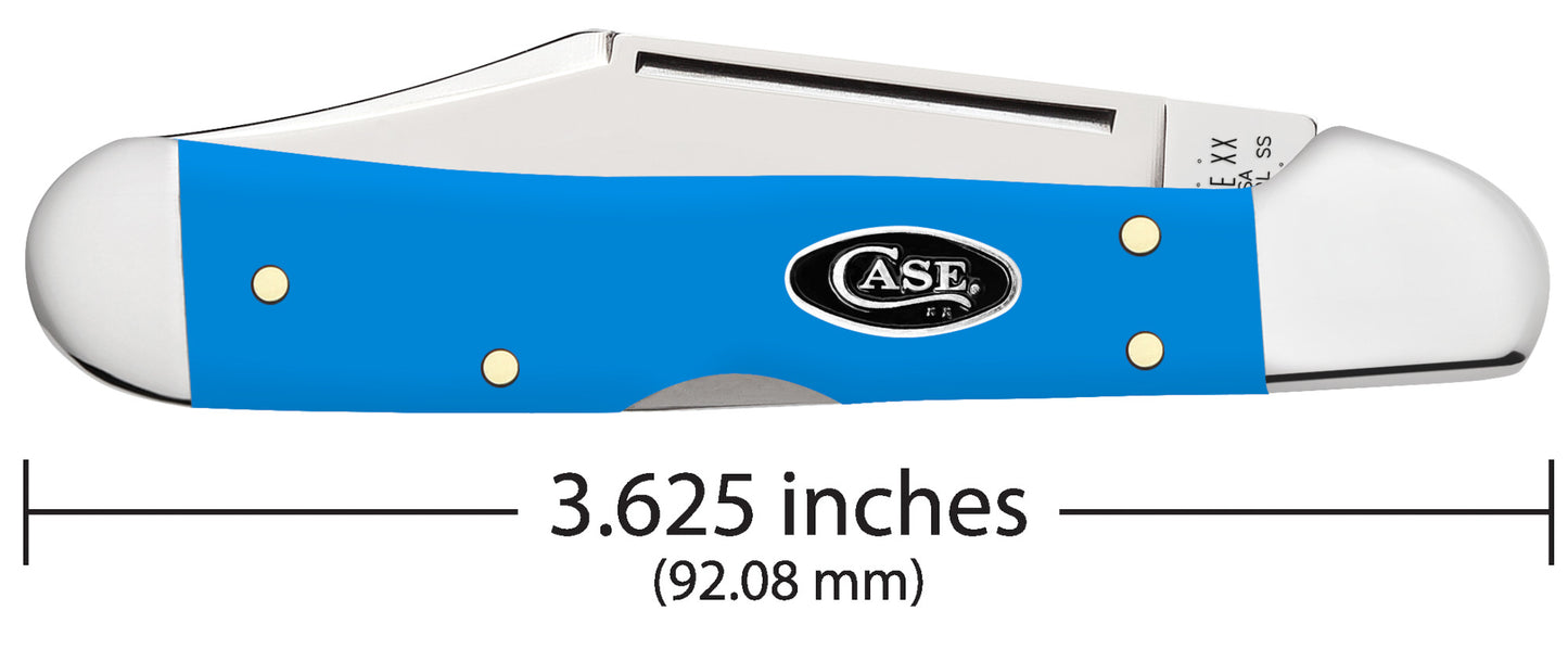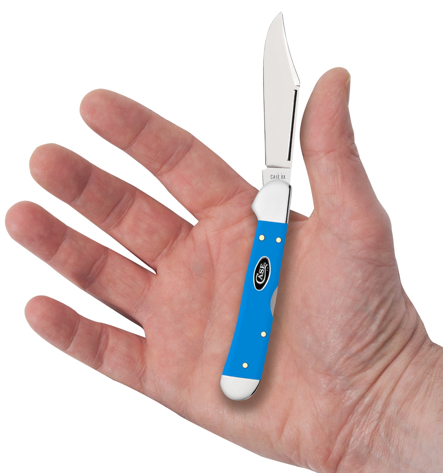Introducing our latest collection, featuring our Light Blue Synthetic handle that combines durability with eye-catching design. Each pattern in this family sports a Black Case Oval shield at center, which strikes a contrast with the bright blue handle. Mirror-polished Tru-Sharp™ surgical steel blades add edge retention and corrosion resistance for years of dependable use. The CopperLock® knife is an original design by W.R. Case that combines elements from the Trapper and Copperhead to make a new lockback knife. The Mini CopperLock® is smaller than the traditional CopperLock® without compromising durability. Featuring a fully locking clip blade, this knife has the cutting power of a lockback, with the look and feel of a traditional Case pocket knife. The Clip blade is commonly used as a multi-purpose blade that makes this pocket knife great for everyday use. This durable folding knife is constructed with Case Tru-Sharp™ stainless steel which is a special high-carbon steel that helps the blades hold an edge longer than conventional steel. It also offers extraordinary blade strength and corrosion resistance. Comes conveniently packaged in a box. Made in Bradford, PA, USA from domestic and imported materials.