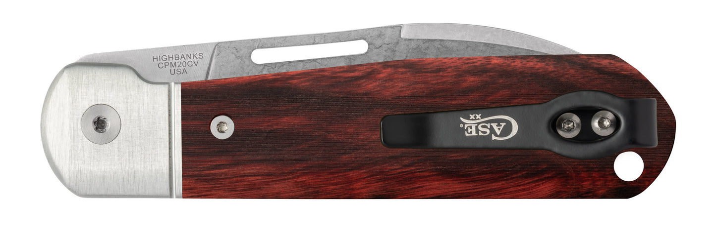 The Highbanks® is a design inspired by traditional patterns, with aluminum frames and bolsters for durability while minimizing weight. The Highbanks features a classic slip joint blade mechanism with a half stop and a durable Dymalux® rosewood handle that’s water resistant. The CPM20CV modified Wharncliffe blade exhibits excellent edge retention with an open nail nick that provides built-in access for opening the blade. The steel, deep carry pocket clip ensures dependable, convenient carrying.