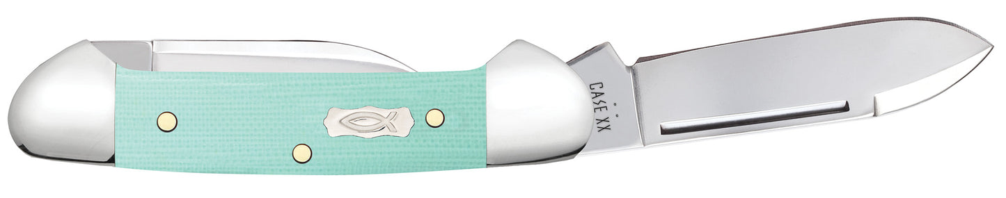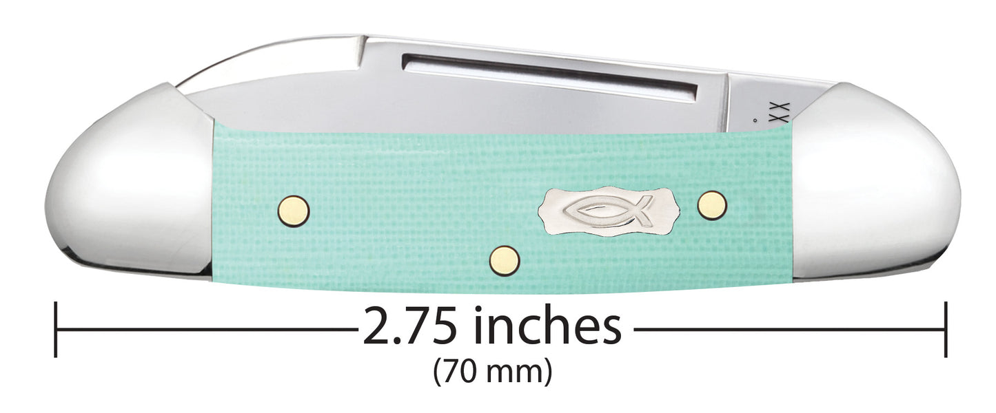 Our Seafoam Green G-10 handles are more than just aesthetically pleasing, they’re also built to endure years of use. The iconic Ichthus shield is a symbol of shared and unyielding faith. The Baby Butterbean is a traditional, functional, and classic knife from Case, also referred to as the Baby Canoe. This durable folding knife features two blades on opposing ends, the spear blade and the pen blade. The spear blade is used as a heavy-duty utility tool and great for piercing. The pen blade is great for light work and good for sharpening. This knife is constructed with Case Tru-Sharp™ stainless steel which is a special high-carbon steel that helps the blades hold an edge longer than conventional steel. It also offers extraordinary blade strength and corrosion resistance. Comes conveniently packaged in a box. Made in Bradford, PA, USA from domestic and imported materials.