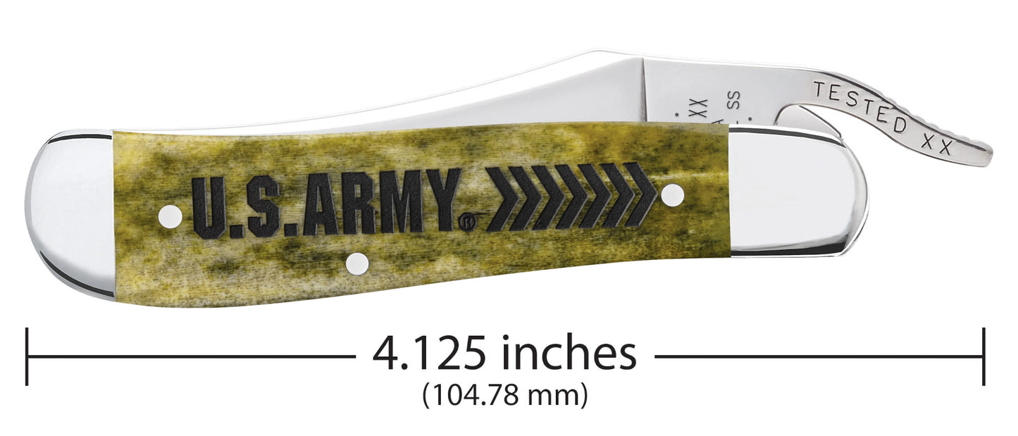 By federal law, licensing fees paid to the U.S. Army for the use of its trademarks provide support for the Army Trademark Licensing Program, and net licensing revenue is devoted to U.S. Army Morale, Welfare, and Recreation programs. U.S. Army name, trademarks and logos are protected under federal law and used under license by W.R. CASE & SONS CUTLERY COMPANY. OFFICIALLY LICENSED PRODUCT OF THE U.S. ARMY |